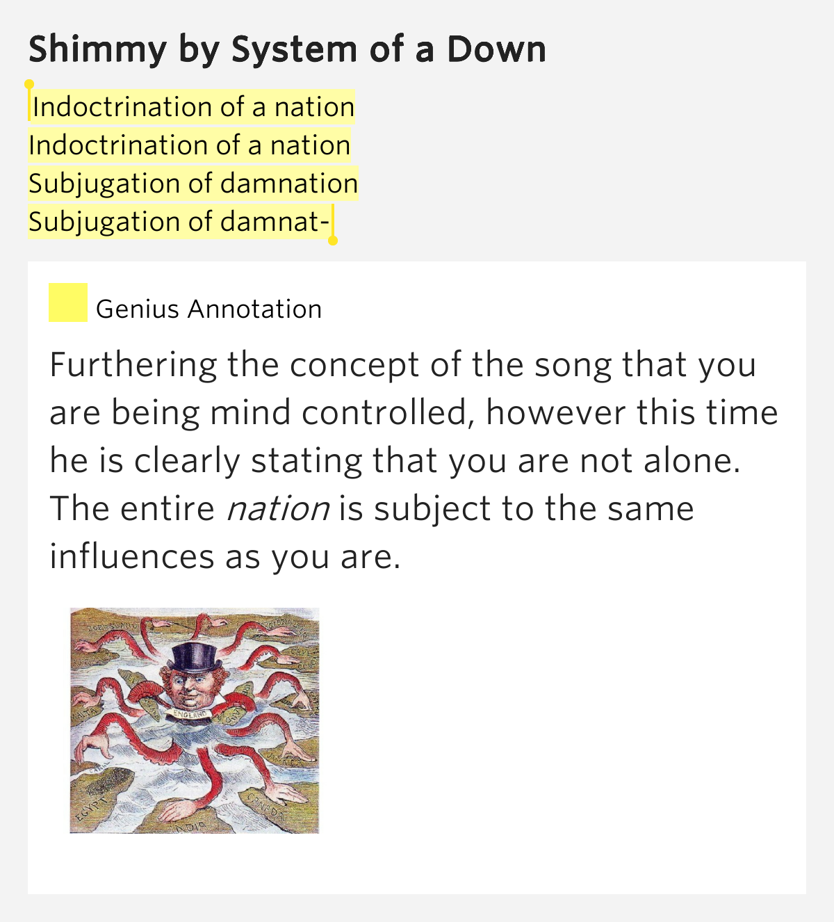 Lyrics to shimmy by system of a down: Education, fornication, in you are, go / education, subjugation, now you're out, go / education, fornication, in you are, go / don't be late for school. I want to shimmy, shimmy, shimmy through the break of dawn, yeah education, fornication, in you are, go education, subjugation, now you’re out, go education, fornication, in you are, go don’t be. Education, fornication, in you are, go, education, subjugation,.